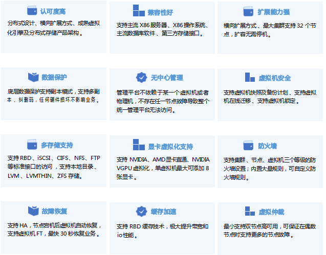 虛擬化場(chǎng)景融合計(jì)算和存儲(chǔ)資源,提供具有極簡(jiǎn) 、高效 、可靠的虛擬化環(huán)境 。提供 OS 一鍵式交互安裝,支持業(yè)務(wù)的快速上線(xiàn),靈活擴(kuò)展 。對(duì)各類(lèi)資源統(tǒng)一管理,按需分配,支持一鍵巡檢 、歷史性能數(shù)據(jù)統(tǒng)一監(jiān)控 。支持第三方虛擬化管理平臺(tái) 、CDP 保護(hù)平臺(tái) 。支持?jǐn)?shù)據(jù)多副本及 EC 技術(shù) ,大幅提升用戶(hù)可得容量 。提供多種安全可靠策略 ,HA 高可用 、備份計(jì)劃,虛擬機(jī)保護(hù),保障業(yè)務(wù)連續(xù) 。